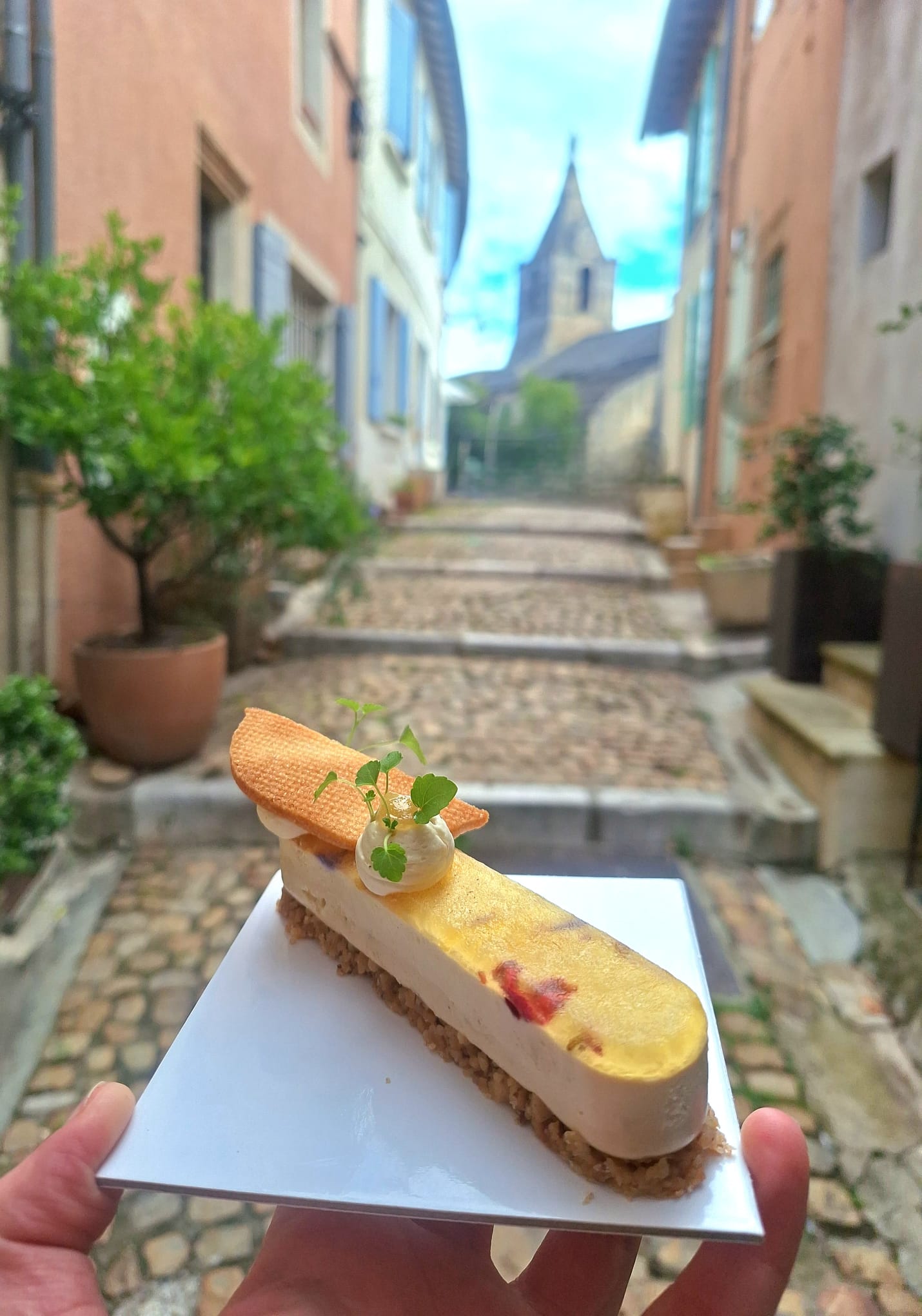 Tartelette à la poudre d’amande bio, moelleux façon madeleine aux œufs frais d’Arles et au zestes de citron bio. Crème et ganache infusées aux bourgeons de pin bio des Cévennes et compoté de coings bio d’Arles.