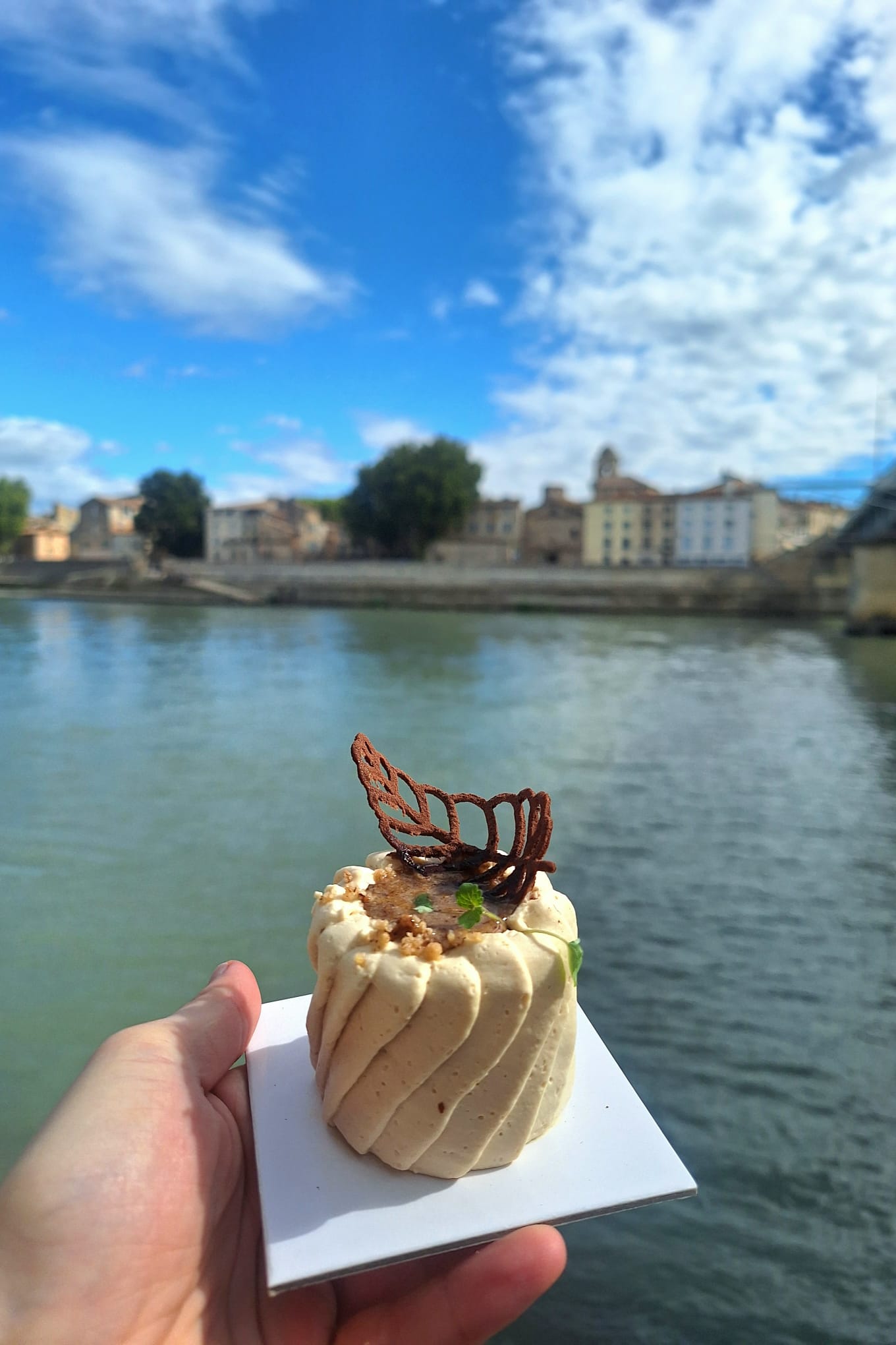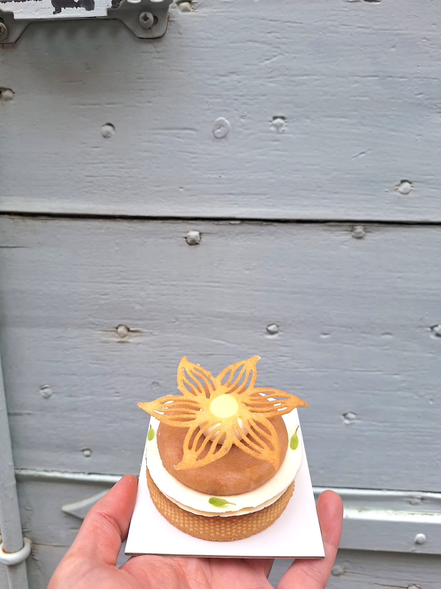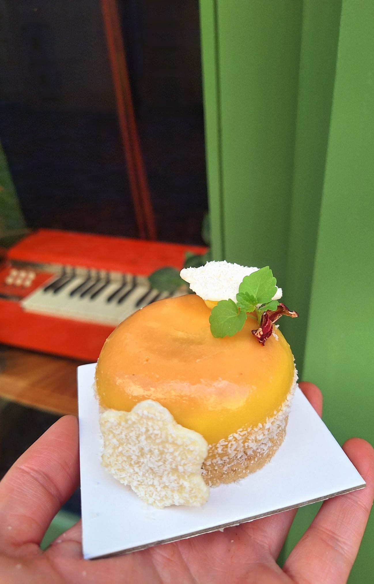 Crémeux mangue bio d’Espagne et citron bio, cœur coulant à la mangue, ganache coco infusée à l’hibiscus frais bio d’Arles et séché. Glaçage naturel à la mangue, crumble croustillant à la poudre d’amandes bio et au thé Rooibos bio. Tuile chocolat blanc vegan.